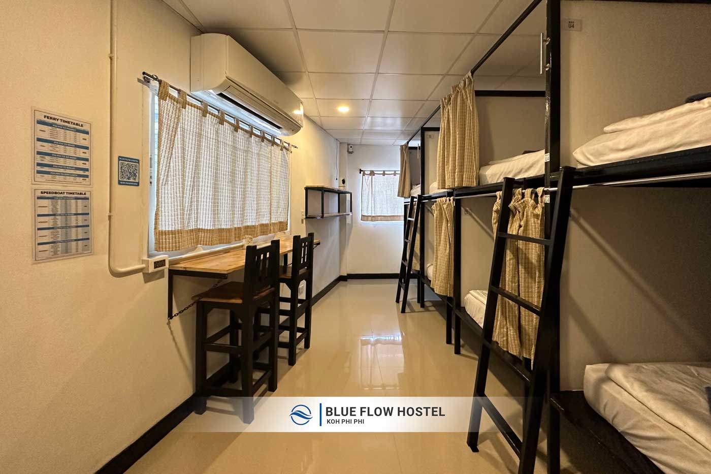The hostel features clean, air-conditioned dorms with cozy beds, privacy curtains, and individual lockers. Guests can enjoy free Wi-Fi, hot showers, and a small outdoor terrace perfect for unwinding or planning adventures. Whether you’re here to explore the iconic Maya Bay, snorkel in crystal-clear waters, or simply relax under the tropical sun, Blue Flow Hostel is the ideal starting point for unforgettable memories in Koh Phi Phi.